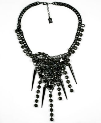 Let your inner rockstar shine with this necklace from Rachel Rachel Roy. This hematite mixed metal necklace features spike and rhinestones dangling from a frontal plate. Without a doubt, we can say it is P.A.L. (Pretty Awesome Looking)!